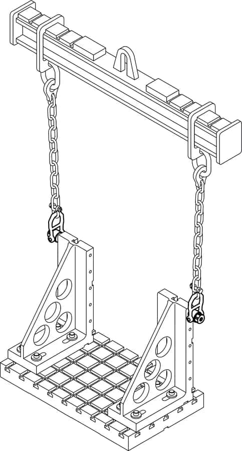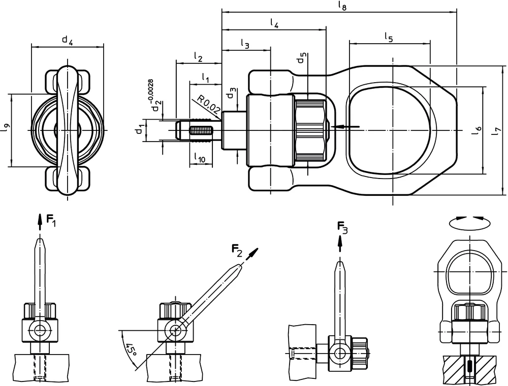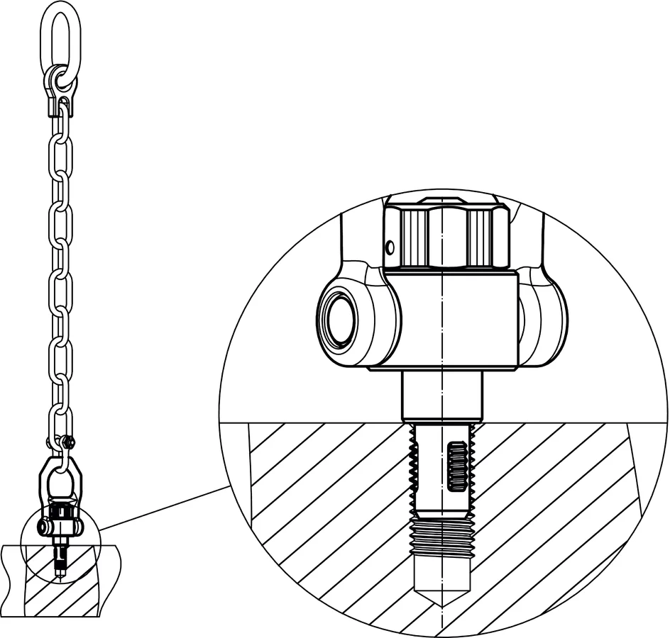 Hızlı ve kolay kullanım için ağır hizmet tipi kaldırma elemanı, istem dışı kilit açmaya karşı koruma sağlamak için hareketli, döndürülebilir kelepçe ve kilitleme saplaması. Yükleri kaldırmak için, dişli kaldırma pimi dişli bir deliğe yerleştirilir. Halka cıvatanın aksine, zaman alıcı vidalama ve çıkarma işlemi bu nedenle gereksizdir. Döndürülebilir kelepçe, pim dönmeden her zaman çekme çekme yönüyle hizalanacaktır. Bu, kaldırma cihazının dişten çıkmasını önler ve bileşen güvenli bir şekilde kaldırılabilir.